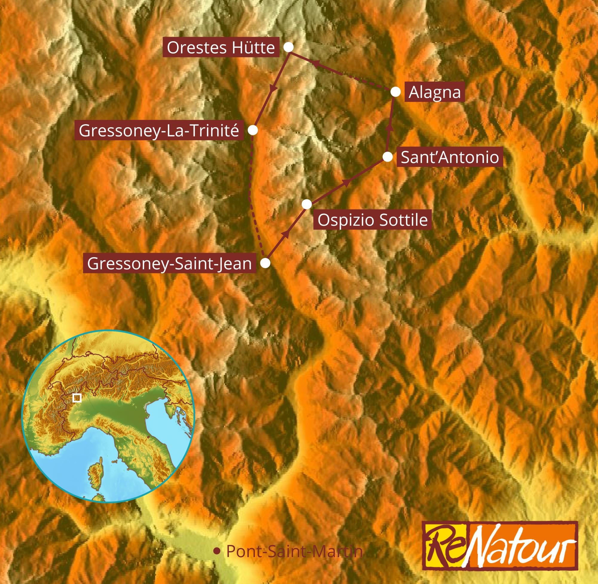 Startort ist Gressoney-Saint-Jean, ein traditionsreiches Walserdorf im malerischen Valle del Lys. Von hier führt die Route über den historischen Pass Col Valdobbia (2.480 m) in das idyllische Valsesia Hochtal – bekannt für seine wildromantische Berglandschaft, steilen Felswände und authentischen Bergdörfer.