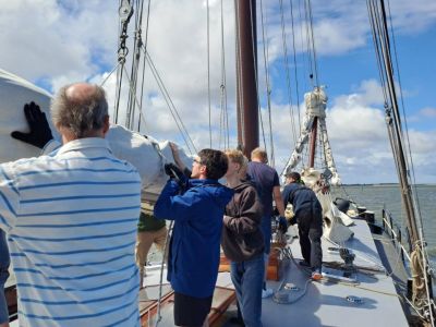 Andreas R.17.08.2015Schon nach 2 Tagen auf der "Nooit Volmaeckt" konnten wir kaum fassen, was wir in dieser Zeit schon alles an außergewöhnlichen Abenteuern erleben durften.Selbst das Bunkern, das Einkaufen, das am Beginn der Reise stand, wurde zum kleinen Abenteuer - für 20 Personen braucht man halt etwas mehr. Und da wir die erste Nacht an einer unbewohnten Insel verbrachten, mußte auch schon für mehrere Tage Essen eingeplant werden. Himmlische Ruhe (Möwengeschrei zählt nicht) war der Lohn dafür. Die zweite Segeletappe führte nach Makkum. Dank des warmen Wetters konnte eine erfrischende Badepause mitten auf dem Ijsselmeer eingelegt werden - das Schiff lag derweil vor Anker. Dank der hervorragenden ruhigen und sicheren Art von Maat und Kapitän wurden alle Reisenden immer sicherer im Umgang mit dem Schiff; jeder konnte im Rahmen seiner Möglichkeiten mit anpacken - manchmal sogar fast alle zusammen! Ein weiterer Höhepunkt war nach einer frühen Abfahrt und Durchfahrt durch die Schleuse das Trockenfallen im Watt. Die unwirkliche Atmosphäre im Watt, nur Sonne und Sand und im Hintergrund das trocken liegende Schiff beeindruckten Groß und Klein. Rechtzeitig zur Flut fanden sich alle wieder auf dem Schiff ein, wo die frisch im Watt gesammelten Muscheln gekocht und direkt an Bord verzehrt wurden - natürlich nicht ohne ein Glas gekühlten Weißweins. So frisch bekommt man Muscheln selten! Frisch weiter gesegelt wurde nach Terschelling. Dort einigten sich alle Reisenden darauf, einen Landtag einzulegen. Dank der Tipps der gut vorbereiteten Reiseleitung traf sich ein Großteil der Reisegesellschaft beim Fahrradverleih und radelte durch idyllische Kiefernwälder zum großen Strand. Abends marschierten alle zusammen vom Schiff aus zum großen Aussichtspunkt in den Dünen und genossen den Anblick der vielen funkelnden Lichter von Schiffen und Signalleuchten im Sonnenuntergang.Am nächsten Tag ging es flott auf von Terschelling nach Texel, dies war der längste Segelschlag der Reise. Zeit für alle Reisenden zu lesen, die Nase in den Wind zu halten oder Segelknoten zu üben. Die Kinder arbeiteten fleißig weiter an den kleinen Aufgaben, die sie von der Reiseleitung gestellt bekommen hatten und für die sie mit heiß begehrten Stempeln in ihren "Juniorsegelausweis" belohnt wurden. Zwischendurch hatten wir das große Glück schwimmende und auf Sandbänken dösende Seerobben zu beobachten, und sogar Schweinswale wurden gesichtet - dies sorgte sogar beim erfahrenen Kapitän für Aufregung!Auf Texel wurde der große Spielplatz am Hafen geentert und die diversen Fischgeschäfte mehrfach besucht.Nach einer Nacht ging es wieder zurück in Richtung Ijsselmeer. Vor der Schleuse rasch nochmal tief die gute Nordseeluft einatmen - das Ijsselmeer riecht tatsächlich anders! Am letzten Abend wurde in Medemblick Abschied gefeiert. In den Tagen an Bord hatten sich alle Mitreisenden harmonisch zu einer gut zusammenarbeitenden Crew zusammengefunden, sowohl Kinder als auch Erwachsene bildeten zusammen eine angenehme und freundliche Reisegesellschaft. Dieser letzte Abend war sehr warm und schwül, und der Kapitän behielt mit seiner Gewitter-Warnung für die Nacht recht. Zum Glück jedoch nicht mit der Sorge, es könnte am letzten Tag noch regnen. Auch beim letzten Segelschlag, zurück nach Enkhuizen, konnten die Regenklamotten in den Taschen bleiben. Im Gegenteil, kurz vor dem Einlaufen in den Hafen konnten nochmal kurz die Badesachen ausgepackt werden und eine letzte Badepause wurde eingelegt - diesmal sogar - für die Kinder - mit Rettungswesten. Nachdem das Schiff wie eine große Entenmutter wieder alle Badenden an Bord genommen hatte wurde unter Motor das letzte Stück in den Hafen zurückgelegt. Hier verabschiedeten sich alle herzlich voneinander und verließen etwas wehmütig, aber braungebrannt und glücklich mit ihrer Segelurkunde in der Hand das Schiff.Presseberichte -