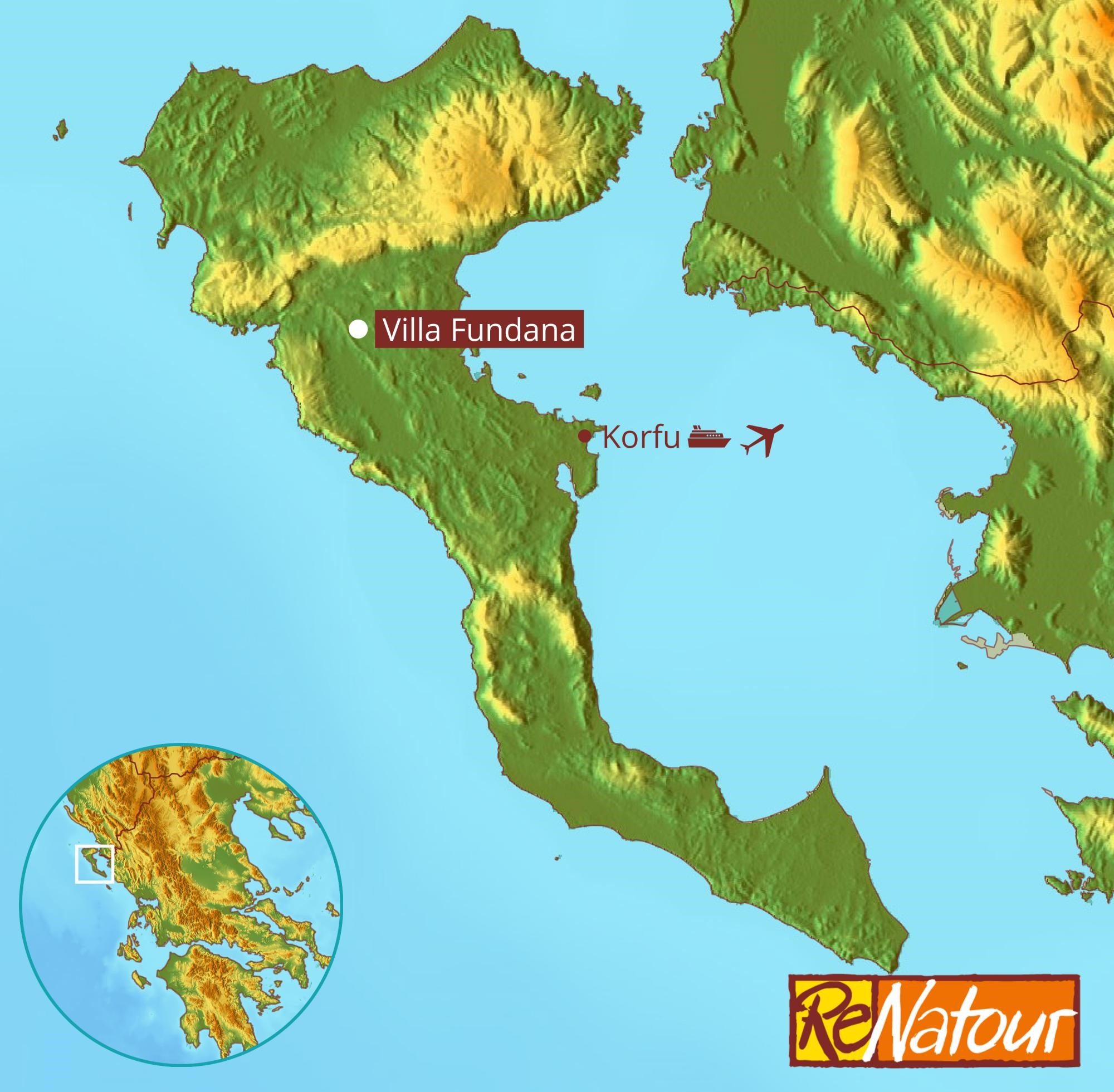 - Mit dem Flugzeug: Flug bis Flughafen Korfu. Weiter mit Mietwagen oder Taxi, Fahrzeit ca. 40 min. (auf Vorbestellung, zahlbar vor Ort) Klimabewusst reisen: Fliegen Sie atmosfair!