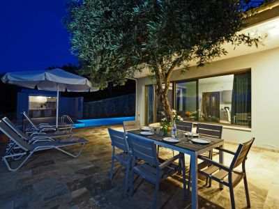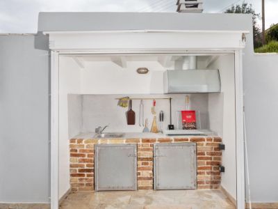 Treten Sie ein in die hochwertig eingerichtete Ferienvilla, in der moderne Einrichtung mit traditioneller Bruchsteintechnik vereint wurden. Das große Wohnzimmer mit offenem Koch-Essbereich ist schlicht, aber stilvoll gehalten. Eine Panoramatür direkt auf die Terrasse mit einem weiteren, überdachten Essbereich. Wer auch beim Kochen die Aussicht genießen möchte, kann dies im BBQ-Bereich.