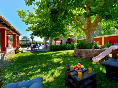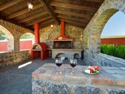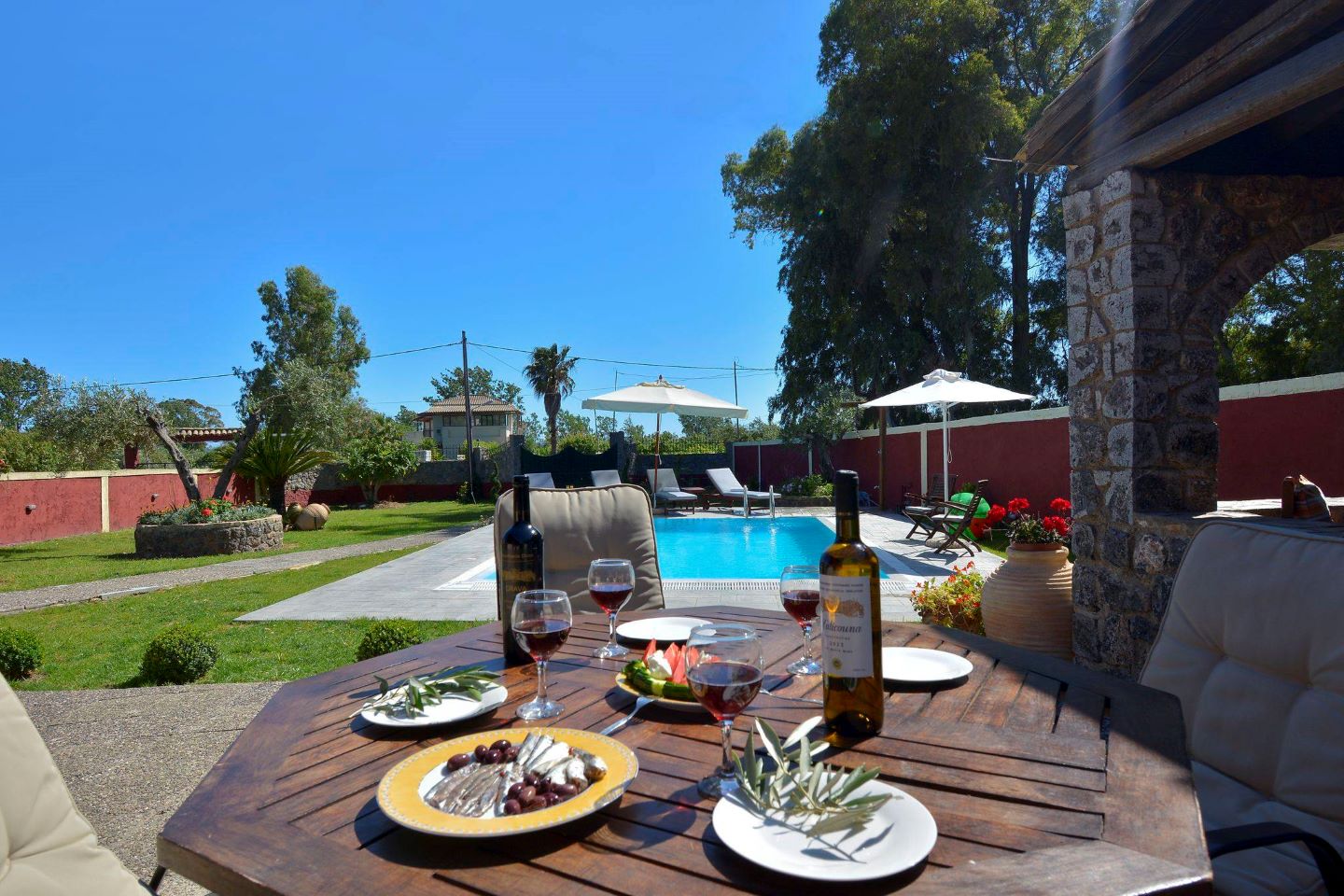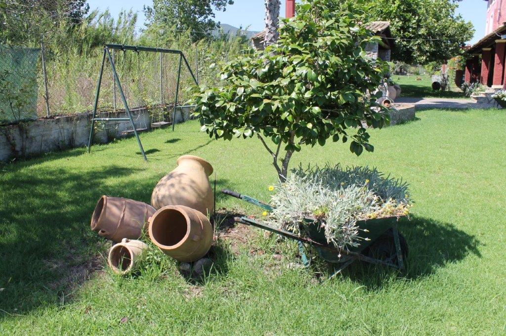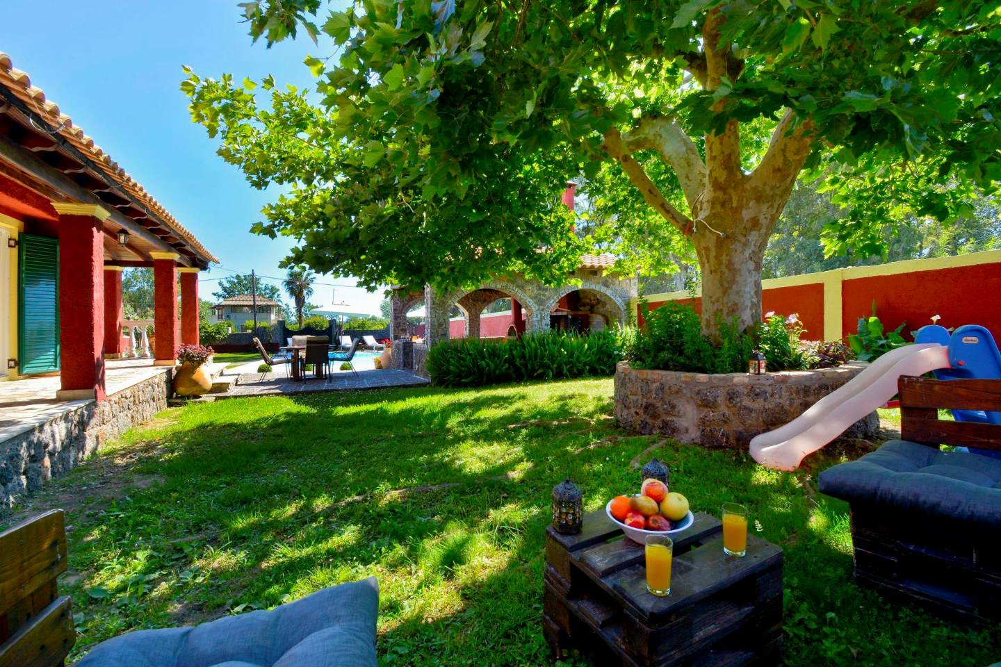 Im Garten verspricht der große Barbeque-Bereich den ein oder anderen lauen Urlaubsabend bei leckerem, selbst gegrilltem Essen. Die Namen gebende Platane steht neben dem Ferienhaus und spendet Ihren Kindern auf den Spielgeräten Schatten. Aber auch ein Liegestuhl findet im Schatten der Platane noch Platz - zum Erholen, Schmökern oder für ein Nickerchen. Der weitläufige Garten bietet genug Raum für alle - ob zum Fußball spielen, Rumtoben oder für die Sonnenhungrigen zum Sonnenbaden auf einer Liege. Viele Details wie die griechischen Amphoren und schön angelegte Blumenbeete laden das Auge zum Verweilen ein und geben dem Garten seine Struktur. Kleine Obstbäume und Palmen, die im ganzen Garten verteilt zu finden sind, runden das Bild ab. Auch Meerblick können Sie genießen - schließlich ist der Strand gerade mal 5-10 Minuten zu Fuß entfernt.