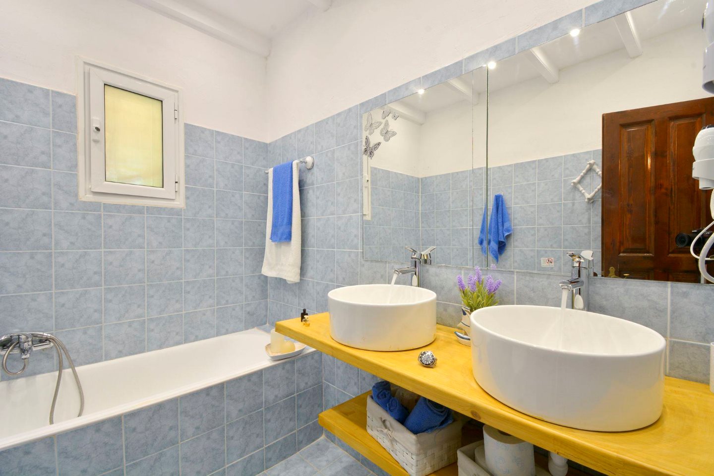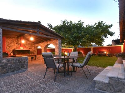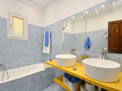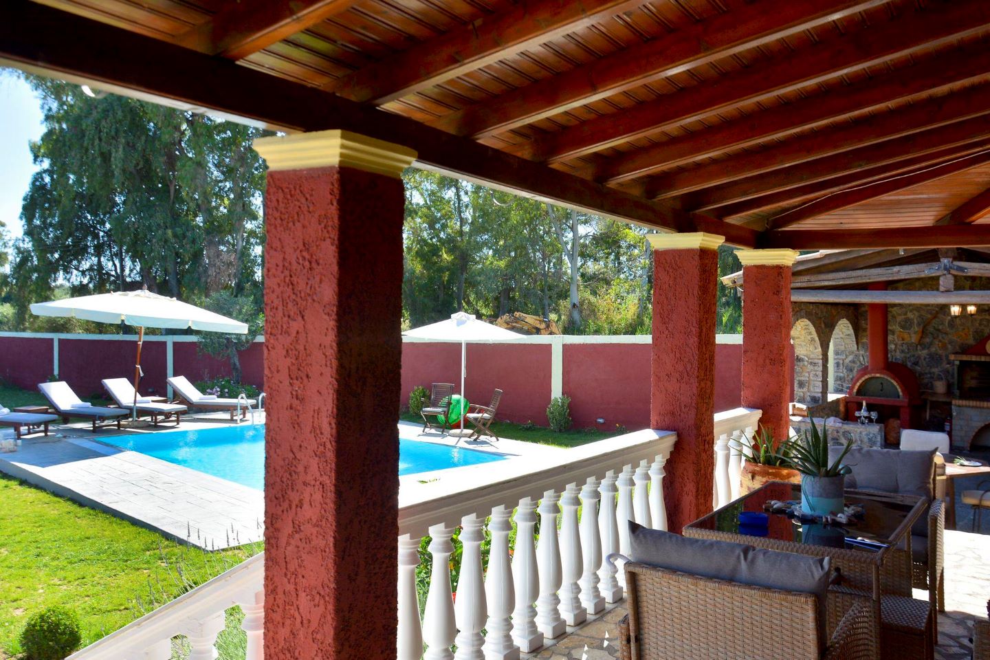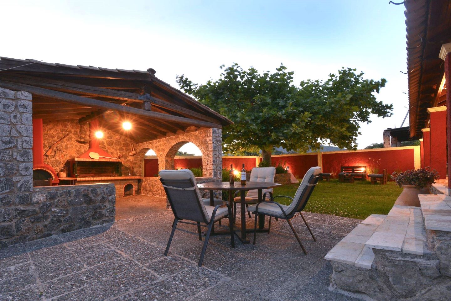 Im Garten verspricht der große Barbeque-Bereich den ein oder anderen lauen Urlaubsabend bei leckerem, selbst gegrilltem Essen. Die Namen gebende Platane steht neben dem Ferienhaus und spendet Ihren Kindern auf den Spielgeräten Schatten. Aber auch ein Liegestuhl findet im Schatten der Platane noch Platz - zum Erholen, Schmökern oder für ein Nickerchen. Der weitläufige Garten bietet genug Raum für alle - ob zum Fußball spielen, Rumtoben oder für die Sonnenhungrigen zum Sonnenbaden auf einer Liege. Viele Details wie die griechischen Amphoren und schön angelegte Blumenbeete laden das Auge zum Verweilen ein und geben dem Garten seine Struktur. Kleine Obstbäume und Palmen, die im ganzen Garten verteilt zu finden sind, runden das Bild ab. Auch Meerblick können Sie genießen - schließlich ist der Strand gerade mal 5-10 Minuten zu Fuß entfernt.