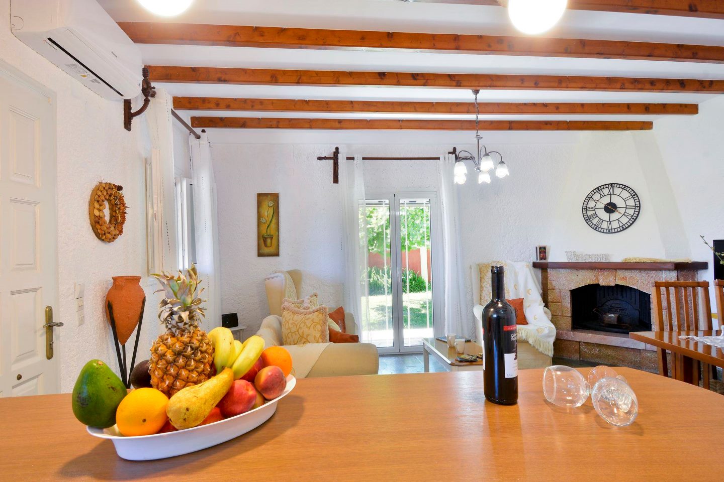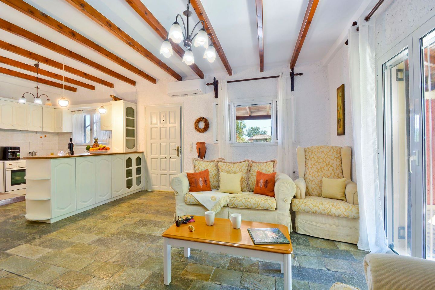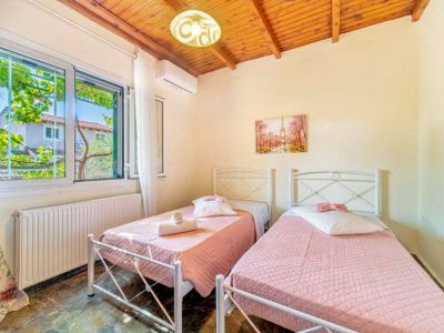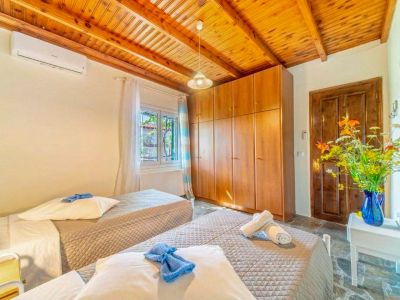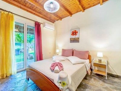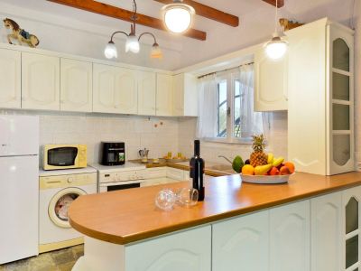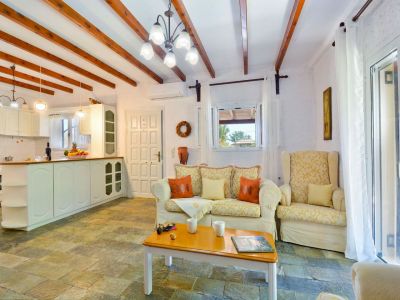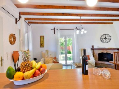 Die Veranda, die um eine Längs- und ein Querseite der Ferienvilla läuft, führt sowohl in den großen Wohn-Ess-Küchenbereich als auch direkt in das Schlafzimmer mit Doppelbett. Zwei weitere Zimmer mit jeweils zwei Einzelbetten vervollständigen den Schlafbereich der Villa Platani im Süden Korfus. Ein Kamin im Wohnbereich sorgt auch an kühleren Abenden für Wärme und Behaglichkeit. Der offen gestaltete Bereich wurde mit stabilen Holzmöbeln und bequemen Sesseln, einem Sofa und vielen weiteren Details eingerichtet. Die offene Küche ist mit den wichtigsten technischen Geräten ausgestattet, die Sie benötigen, um auch im Urlaub Ihre Familie oder Freunde versorgen zu können.