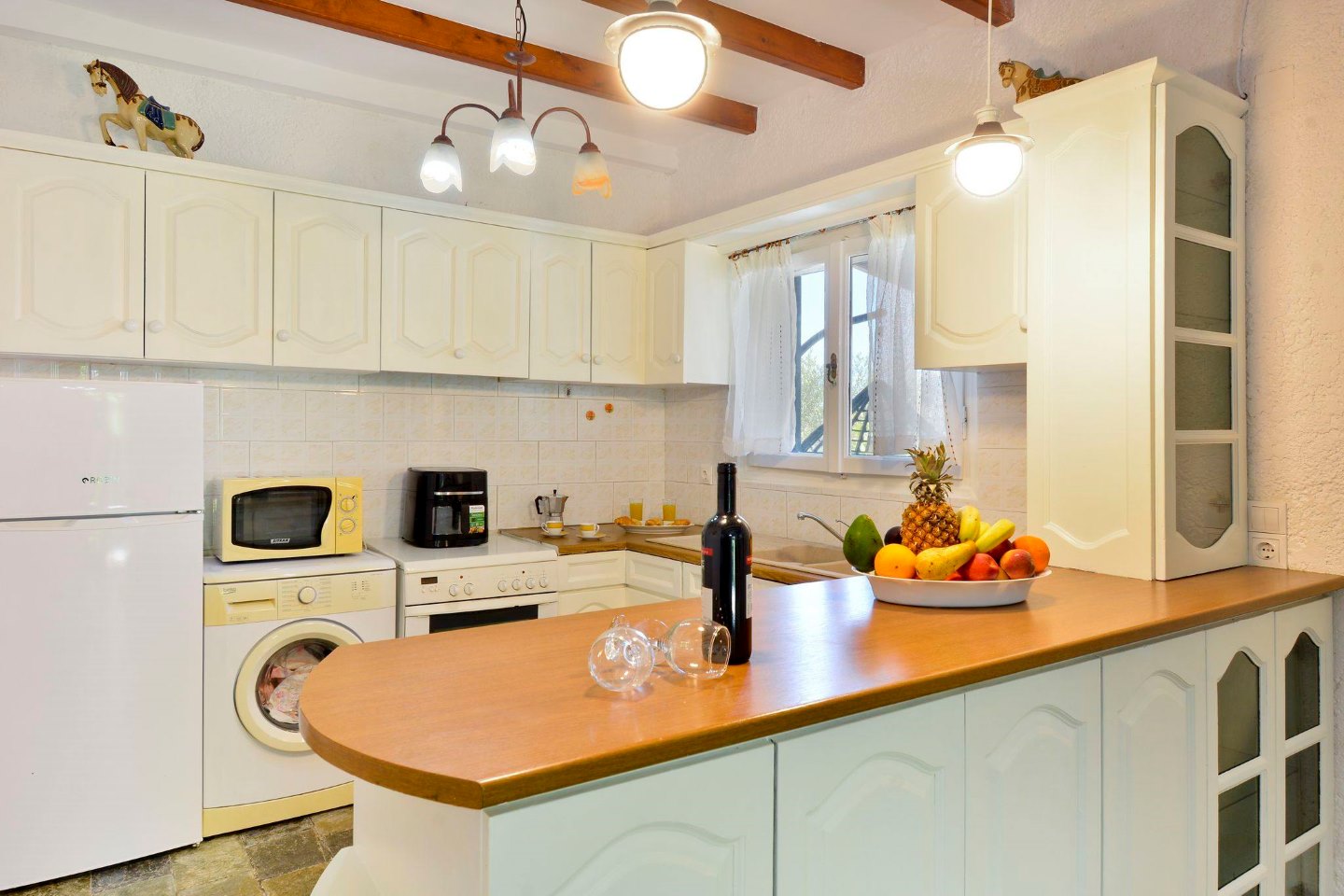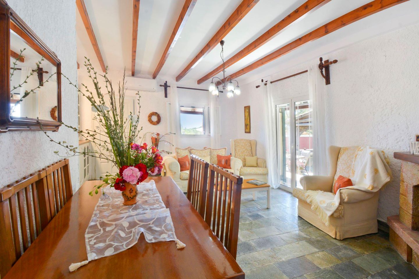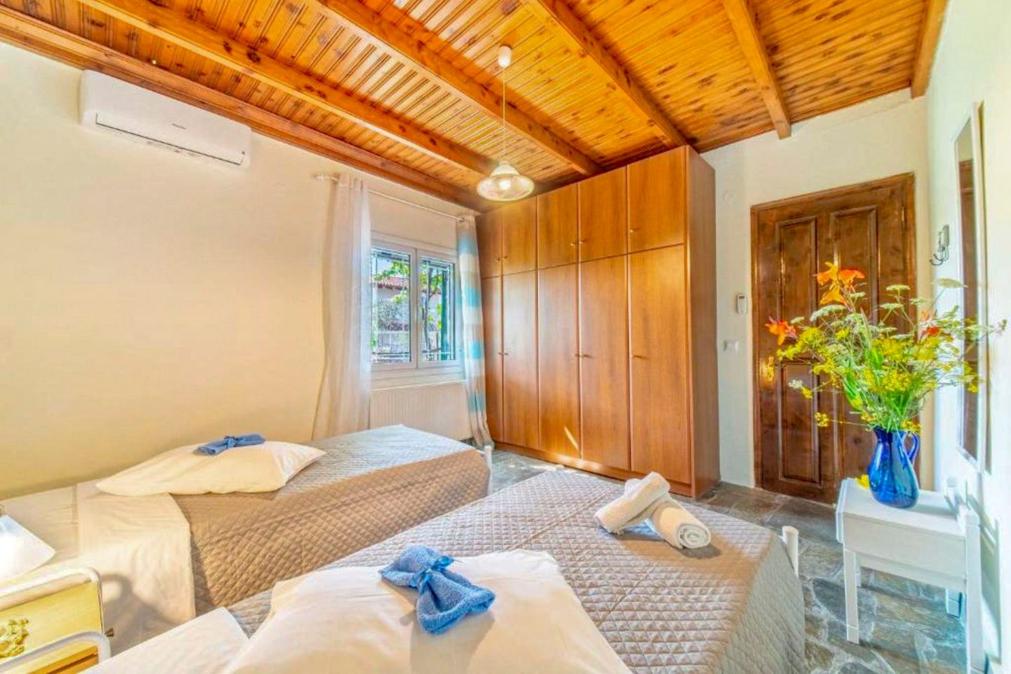 Die Veranda, die um eine Längs- und ein Querseite der Ferienvilla läuft, führt sowohl in den großen Wohn-Ess-Küchenbereich als auch direkt in das Schlafzimmer mit Doppelbett. Zwei weitere Zimmer mit jeweils zwei Einzelbetten vervollständigen den Schlafbereich der Villa Platani im Süden Korfus. Ein Kamin im Wohnbereich sorgt auch an kühleren Abenden für Wärme und Behaglichkeit. Der offen gestaltete Bereich wurde mit stabilen Holzmöbeln und bequemen Sesseln, einem Sofa und vielen weiteren Details eingerichtet. Die offene Küche ist mit den wichtigsten technischen Geräten ausgestattet, die Sie benötigen, um auch im Urlaub Ihre Familie oder Freunde versorgen zu können.