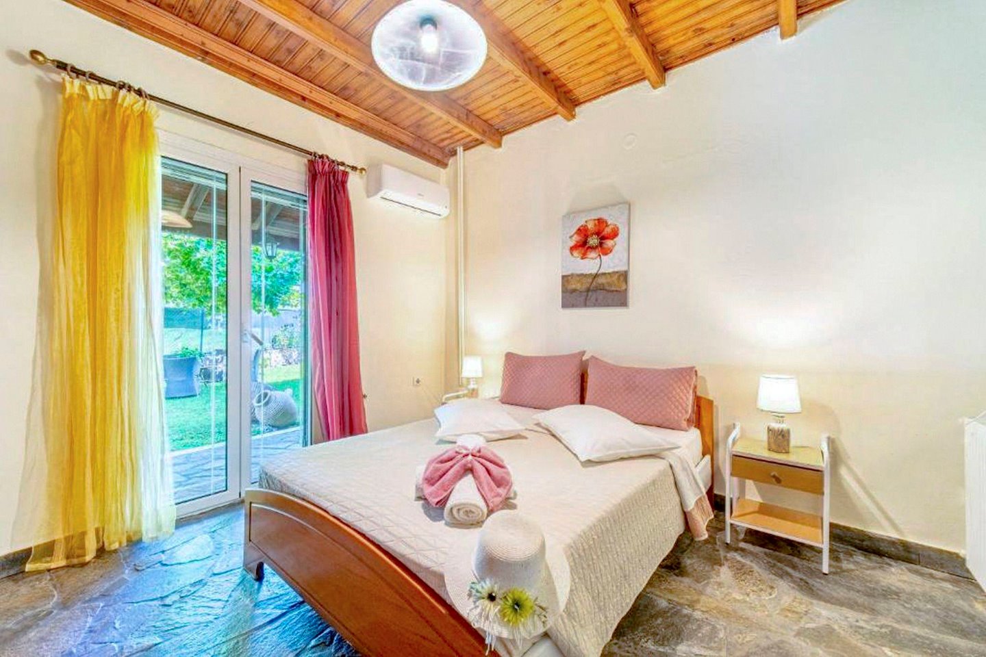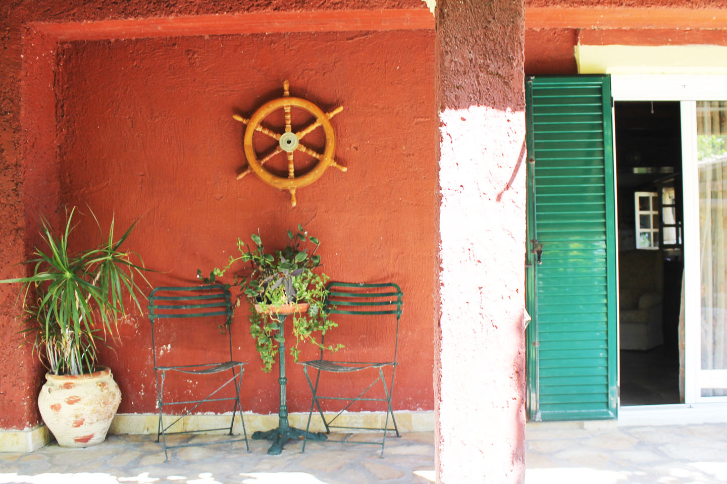 Die Villa und der Garten wurden in liebevoller Kleinarbeit von den Besitzern als Wochenendhaus gebaut. Gehen Sie bei Ihrem Korfu-Urlaub auf Entdeckungstour. Für die Saison 2024 erstrahlt die Villa Platani an der Westküste Korfus in neuem Glanz - mit Rücksicht auf bauliche Besonderheiten wurde das Ferienhaus renoviert. Auffällig ist der große, überdachte Grillbereich mit Esstisch und Stühlen. Ruings um das Haus verläuft eine offene Veranda. Auch hier auf der Veranda finden Sie wieder Beispiele der Handwerkskunst Ihrer Gastgeber - zum Beispiel eine aus Paletten geschmackvoll gestaltete Sitzgarnitur bestehend aus Stühlen, Tischchen und Bank. Die drei schlicht eingerichteten Schlafzimmer bieten Platz für bis zu 6 Personen - in der Villa Platani fühlen sich Familien mit Kindern genauso wohl wie gemeinsam reisende Freunde. Neu für die Saison 2024 ist der Pool - jederzeit für eine Erfrischung gut. Und danach entspannen im schattigen Garten oder auf zum nahe gelegenen Strand (ca. 750 m).
