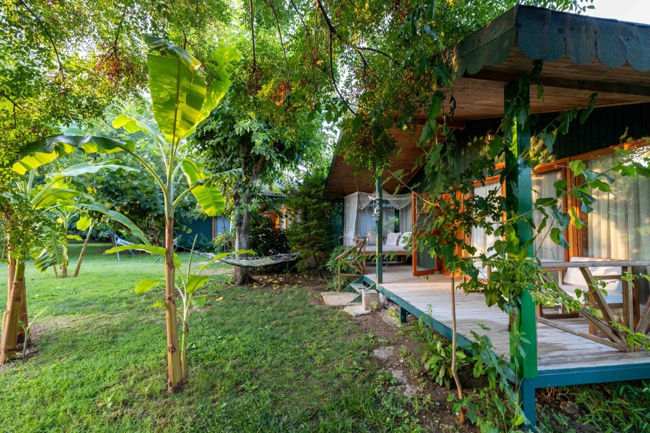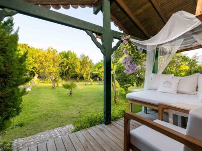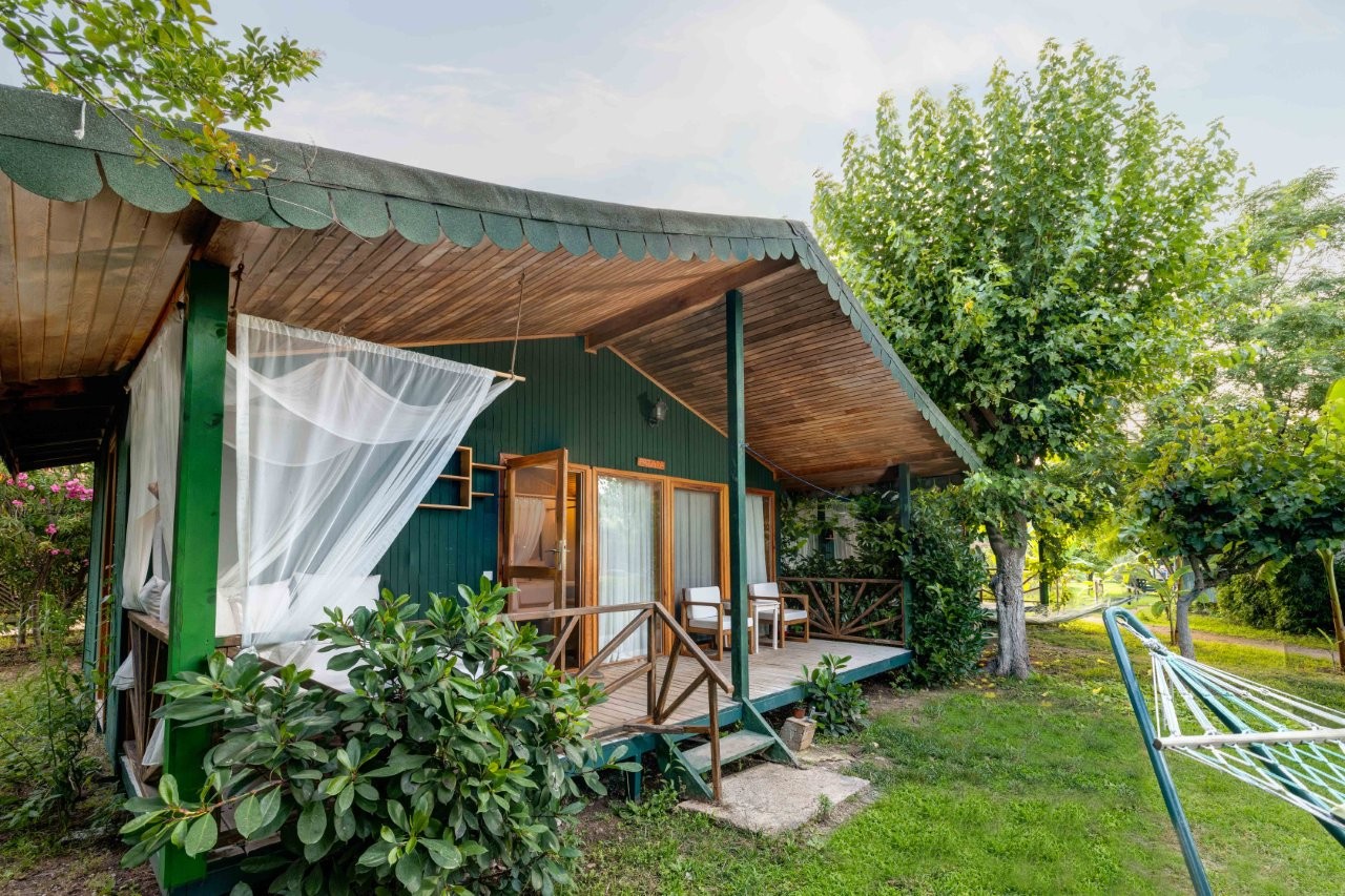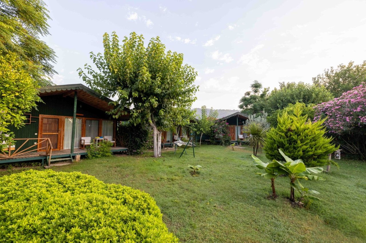 Eingebettet in einem schönen Garten aus verschiedenen Bäumen, Blumen und Kieselpfaden verzaubern die gepflegten Bungalows mit ihrem ganz eigenen Charme. Jedes der 17 freistehenden Holzhäuschen ist freundlich eingerichtet und verfügt über eine Klimaanlage, Internet (Wi-Fi), Mini-Bar, Tee-/Kaffeestation, Kühlschrank sowie ein modernes Badezimmer. Orthopädische Betten sorgen für einen besonders erholsamen Schlaf. Die gemütliche Veranda und dazugehörige Hängematte laden während diesem Individualurlaub zum Entspannen ein. Von Ihrem Bungalow aus sind es nur wenige Schritte zum kilometerlangen Sandstrand. Sonnenschirme und Liegestühle stehen den Hausgästen während des Türkei-Strandurlaubs gratis zur Verfügung.