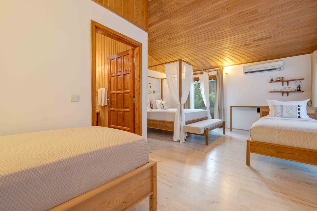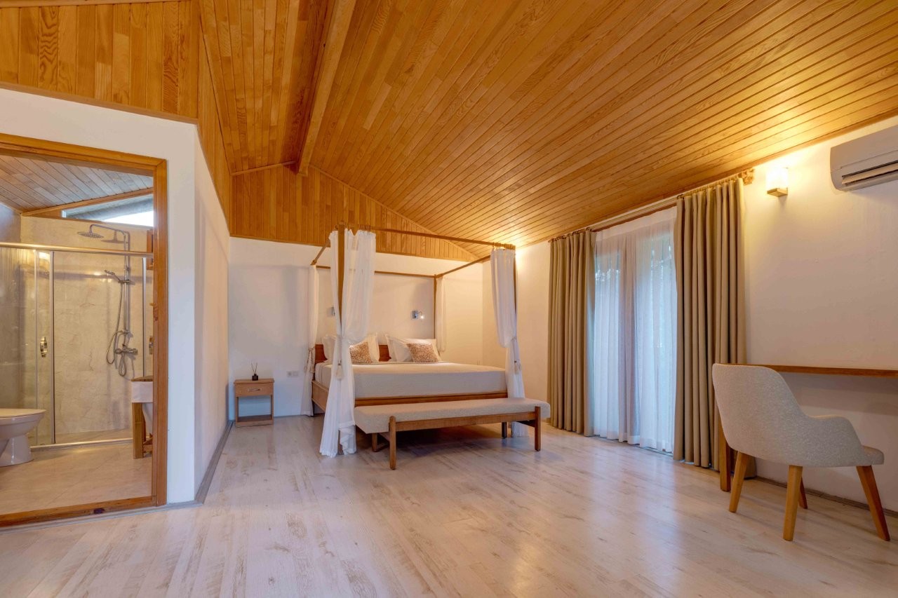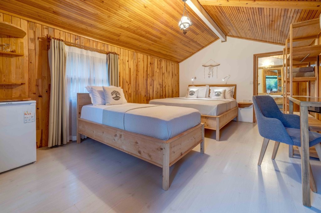 Eingebettet in einem schönen Garten aus verschiedenen Bäumen, Blumen und Kieselpfaden verzaubern die gepflegten Bungalows mit ihrem ganz eigenen Charme. Jedes der 17 freistehenden Holzhäuschen ist freundlich eingerichtet und verfügt über eine Klimaanlage, Internet (Wi-Fi), Mini-Bar, Tee-/Kaffeestation, Kühlschrank sowie ein modernes Badezimmer. Orthopädische Betten sorgen für einen besonders erholsamen Schlaf. Die gemütliche Veranda und dazugehörige Hängematte laden während diesem Individualurlaub zum Entspannen ein. Von Ihrem Bungalow aus sind es nur wenige Schritte zum kilometerlangen Sandstrand. Sonnenschirme und Liegestühle stehen den Hausgästen während des Türkei-Strandurlaubs gratis zur Verfügung.